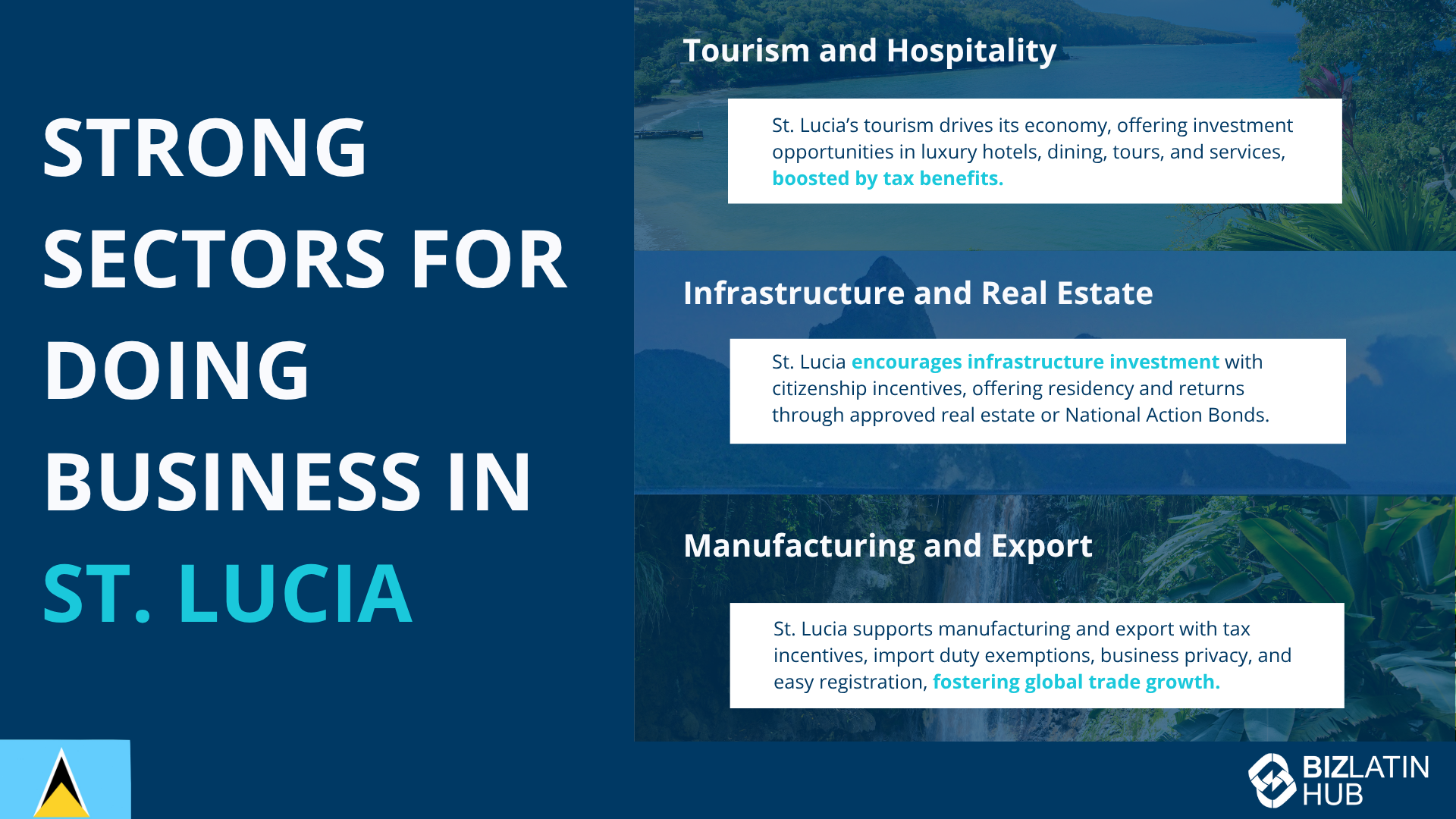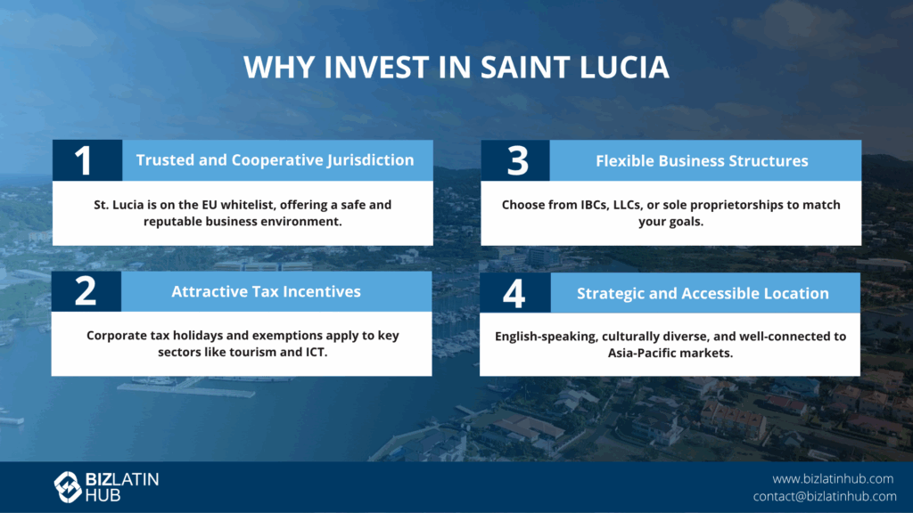 Businesses in St. Lucia benefit from no capital gains tax, no wealth or inheritance taxes, corporate tax holidays, and duty-free concessions. International companies also enjoy no withholding taxes on dividends, interest, or royalties for non-residents.