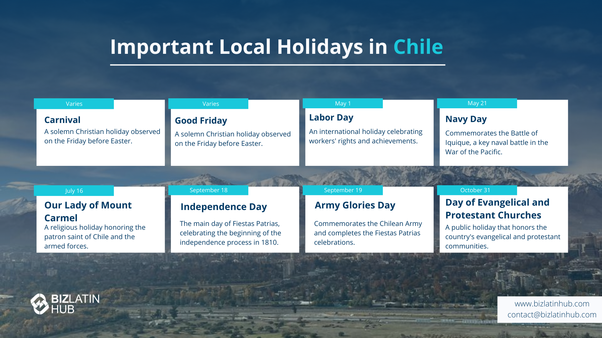 Public holidays in Chile greatly affect business operations. Be aware of these holidays when planning business in Chile.