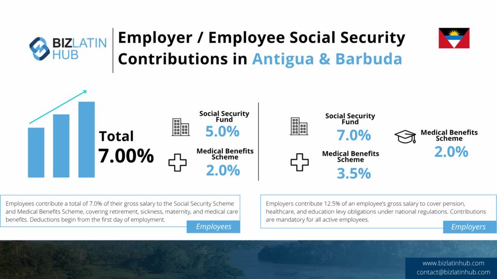 | What social security contributions are necessary in Antigua and Barbuda? | Employers are required to contribute to the Social Security Scheme and the Medical Benefits Scheme on behalf of their employees. |
