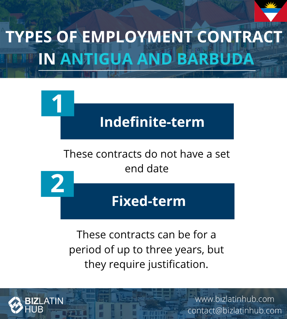 | Types of Employment Contracts in Antigua and Barbuda | Fixed term or Indefinite. |