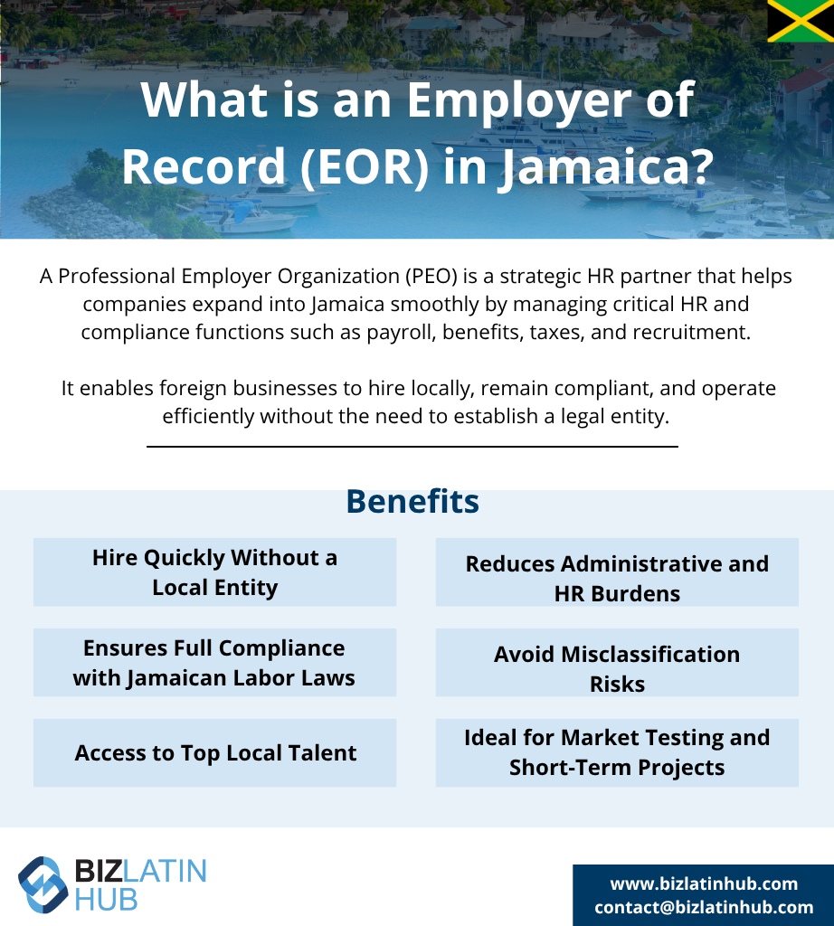 | What are the benefits of hiring through an EOR in Jamaica? | An EOR ensures compliance with local labor laws and simplifies payroll and HR management. It also enables faster market entry and reduces administrative burden. |