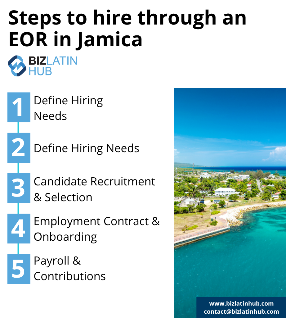 | Steps to hire through an EOR in Jamaica | First, select a trusted provider and define the role you need. The EOR then handles onboarding, contracts, and ongoing HR support. |