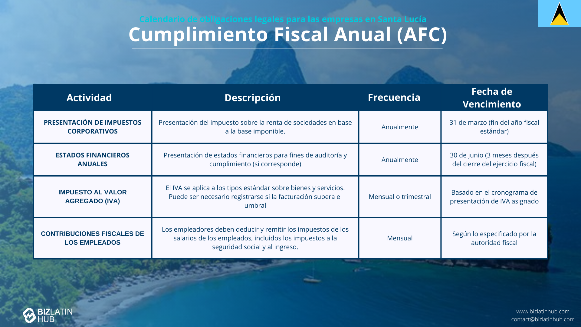 Las obligaciones fiscales son otro punto de control de tu chequeo de salud de la entidad en Santa Lucía. Las empresas residentes en Santa Lucía pagan un impuesto de sociedades del 30% sobre los ingresos obtenidos dentro de Santa Lucía. Las empresas no residentes también pagan impuestos sobre sus ingresos obtenidos en Santa Lucía. El chequeo de la entidad en Santa Lucía verifica la correcta declaración de impuestos.