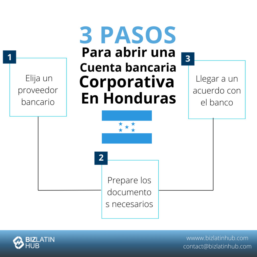 | El proceso de tres pasos para abrir una cuenta bancaria corporativa en Honduras | Paso 1 – Elige un proveedor bancario. Paso 2 – Prepara los documentos necesarios. Paso 3 – Ponte de acuerdo con el banco. |