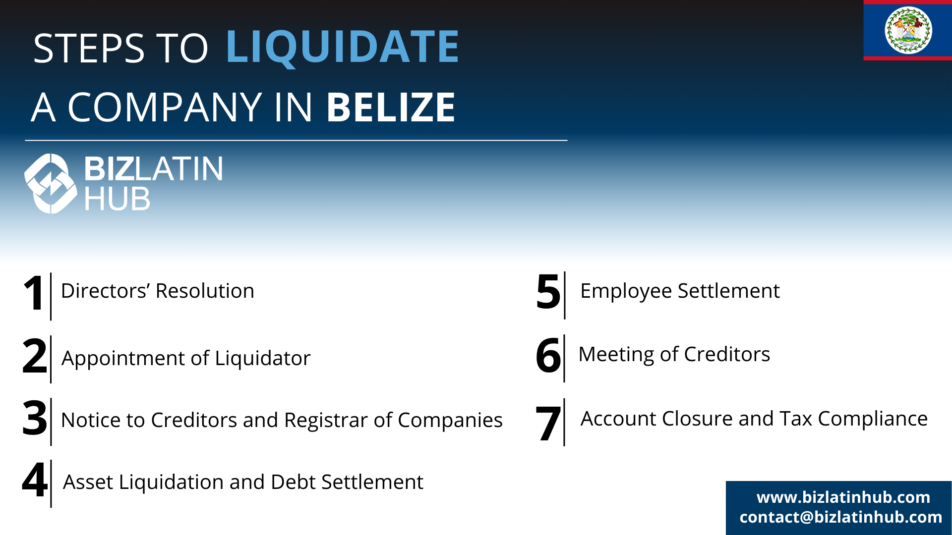 7 Pasos para liquidar una empresa en Belice | Paso 1: Crear un Plan de Liquidación Paso 2: Aprobar una Resolución de los Accionistas Paso 3: Presentar una Notificación en el Registro Paso 4: Nombrar a un Liquidador Autorizado Paso 5: Resolver los Asuntos de la Empresa Paso 6: Presentar los Estatutos de Disolución |