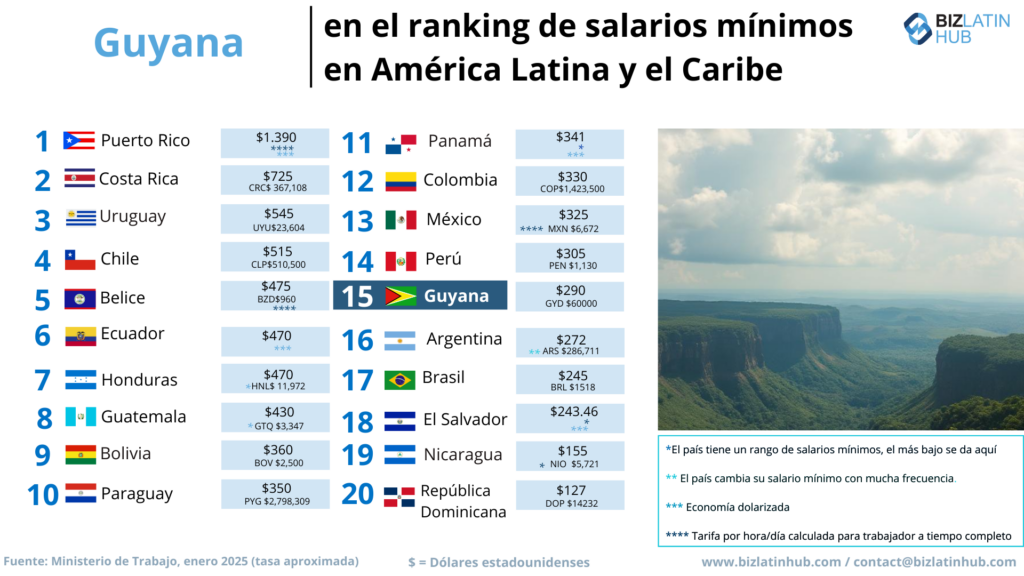 ¿Cuál es el salario mínimo en Guyana? | 60.000 GYD (unos 290 USD) |