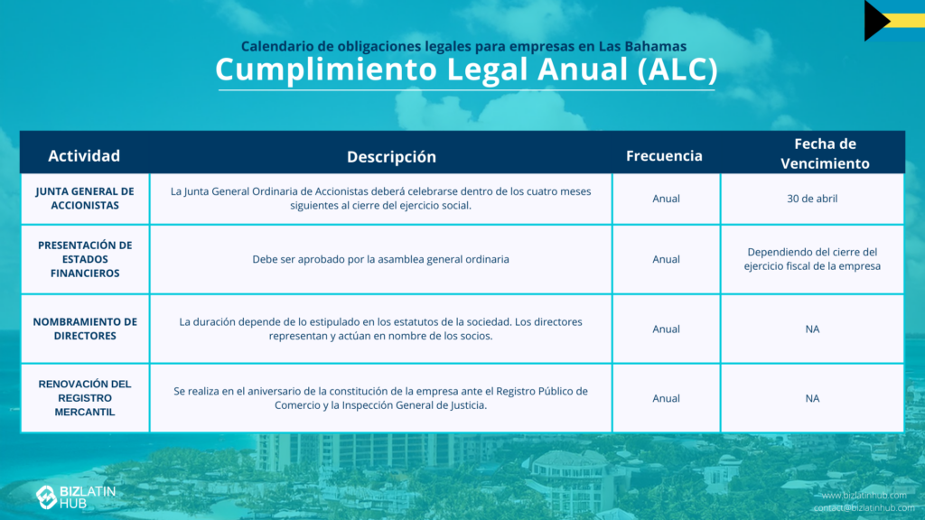 Las empresas de Bahamas deben mantener un domicilio social, que actúa como su dirección legal. Esta oficina es esencial para recibir correspondencia oficial y documentos legales.