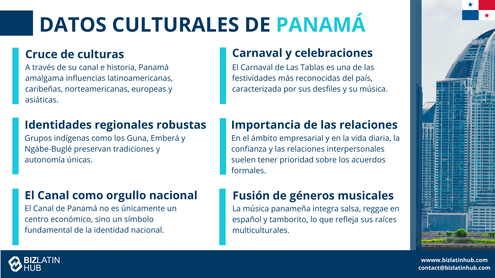 Las operaciones de Biz Latin Hub en Ciudad de Panamá nos permiten proporcionar orientación privilegiada para navegar por las costumbres locales y las prácticas profesionales.