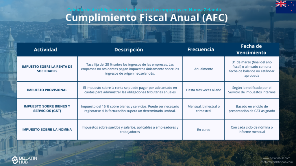 El cumplimiento fiscal anual en Nueva Zelanda implica lo siguiente:
