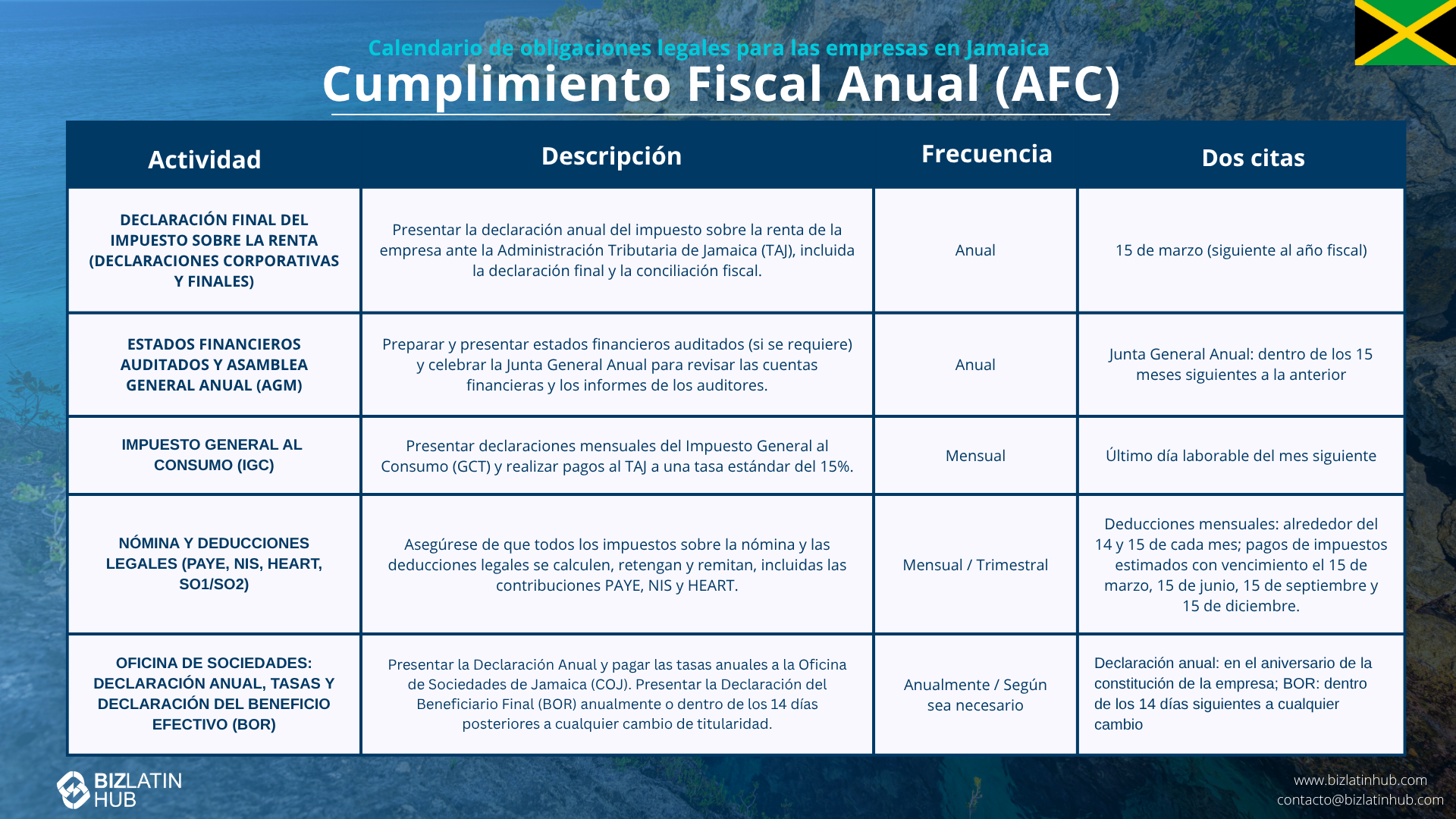 | ¿Cuáles son los pasos para el cumplimiento fiscal anual? | Presentar el formulario de declaración anual de impuestos a la Administración Tributaria de Jamaica (TAJ) Presentar anualmente los estados financieros Pagar las tasas anuales a la Oficina de Empresas de Jamaica (COJ) |