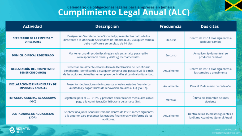No son excesivamente complejos, sin embargo, es importante que todas las empresas cumplan los siguientes requisitos y garanticen el pleno cumplimiento corporativo cuando realicen actividades comerciales en Jamaica.