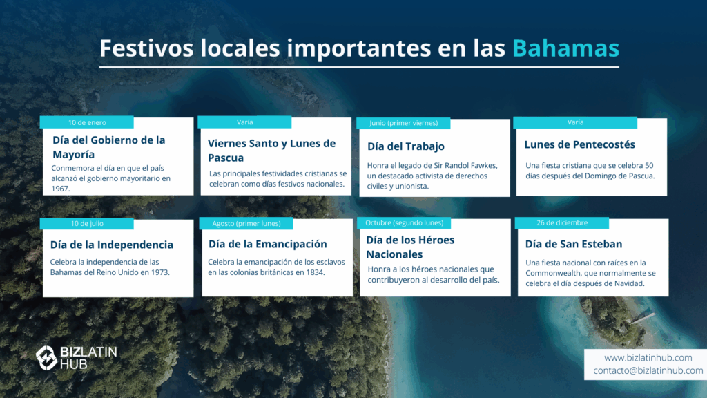 - Las Bahamas tienen múltiples fiestas públicas/nacionales (Día de la Independencia, fiestas religiosas, etc.). Los negocios pueden ralentizarse o detenerse en estas fechas.
