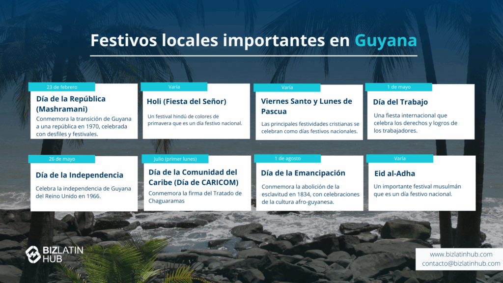 Guyana observa una gran variedad de días festivos legales. Las empresas -especialmente las oficinas gubernamentales y los bancos- pueden cerrar en estos días: