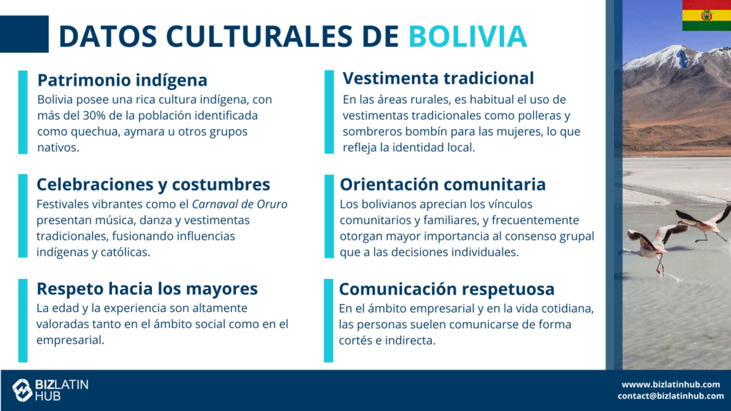 Esta información te ayuda a trabajar dentro de la cultura empresarial boliviana. Favorece el éxito de los negocios.