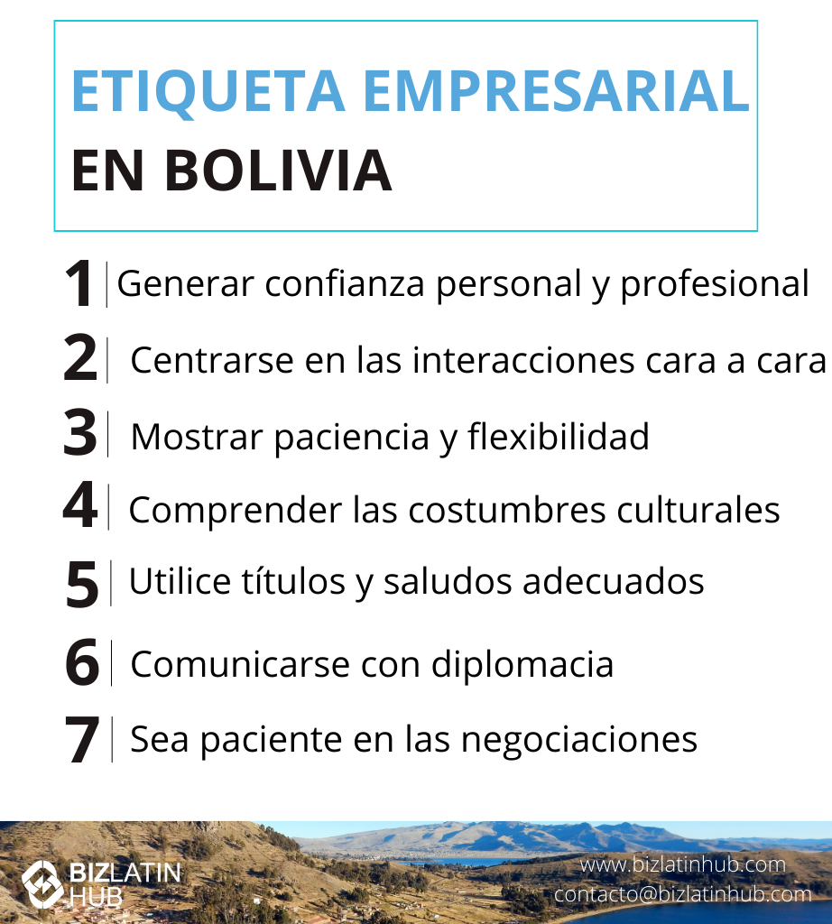 En el mundo de los negocios de Bolivia es muy importante construir relaciones personales sólidas y de confianza. Estas cosas son tan importantes como las aptitudes profesionales. La paciencia y la flexibilidad ayudan en Bolivia. Las decisiones allí a menudo necesitan el acuerdo de todos.