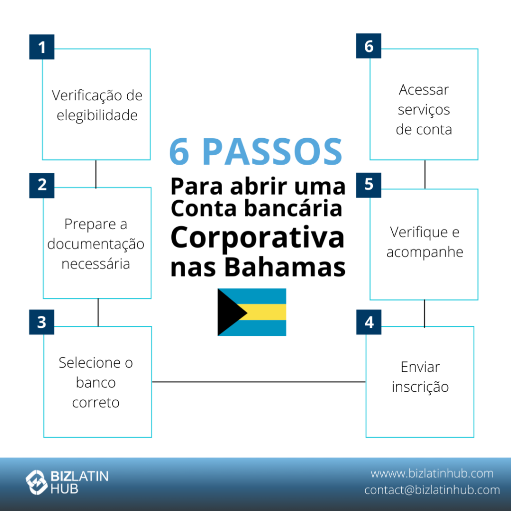 O processo para abrir uma conta bancária corporativa nas Bahamas: | Para abrir uma conta bancária nas Bahamas, você deve seguir estas etapas: Reúna seus documentos Faça a solicitação pessoalmente ou on-line Aguarde o banco verificar seus documentos Faça um depósito mínimo |