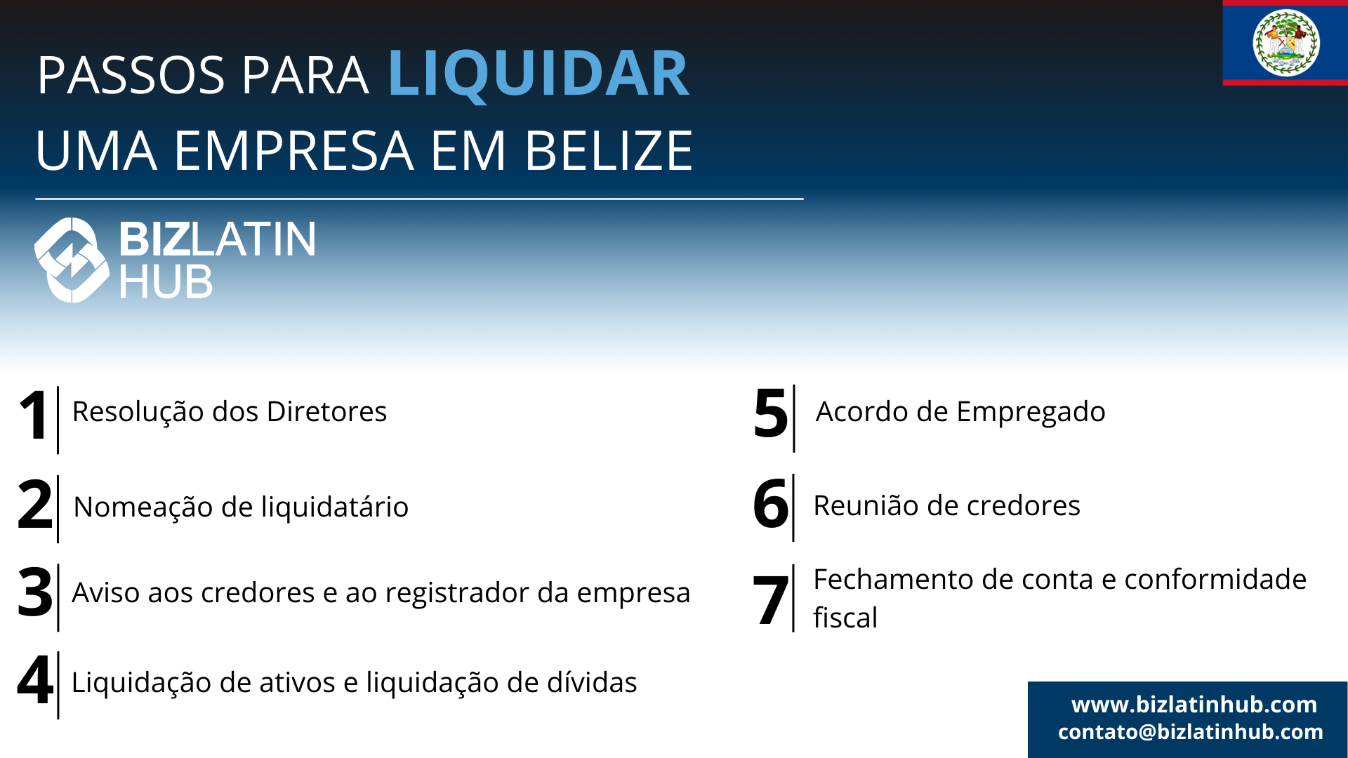 | 7 etapas para liquidar uma empresa em Belize | Etapa 1: Criar um Plano de Liquidação Etapa 2: Aprovar uma Resolução de Acionistas Etapa 3: Apresentar uma Notificação ao Registrador Etapa 4: Nomear um Liquidante Licenciado Etapa 5: Resolver os Assuntos da Empresa Etapa 6: Apresentar Artigos de Dissolução |