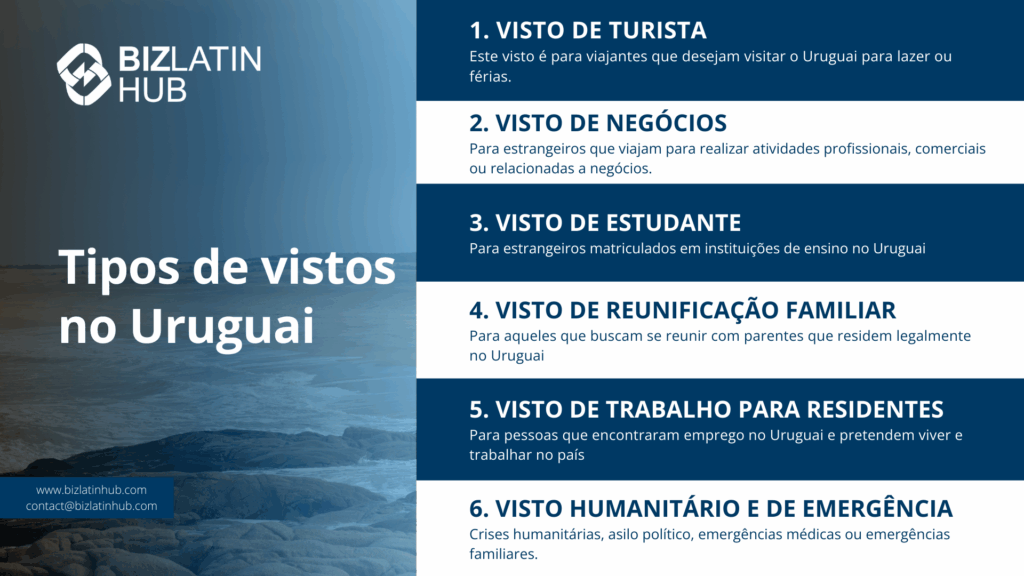 O Uruguai oferece diferentes tipos detipos de vistos para cidadãos estrangeiros, incluindo os seguintes: