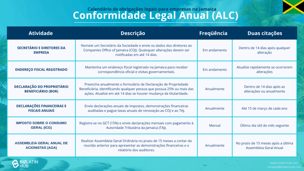 A conformidade legal corporativa na Jamaica garante a transparência e combate a corrupção. Entender essas regulamentações é fundamental quando você ao incorporar uma empresa na Jamaicagarantindo a conformidade desde o início. A conformidade tributária local é administrada pela Administração Tributária da Jamaica (TAJ) e pelo Escritório de Empresas da Jamaica (COJ). Este guia detalha as obrigações legais recorrentes necessárias para manter o status de “Good Standing” de uma empresa junto ao Companies Office of Jamaica (COJ).