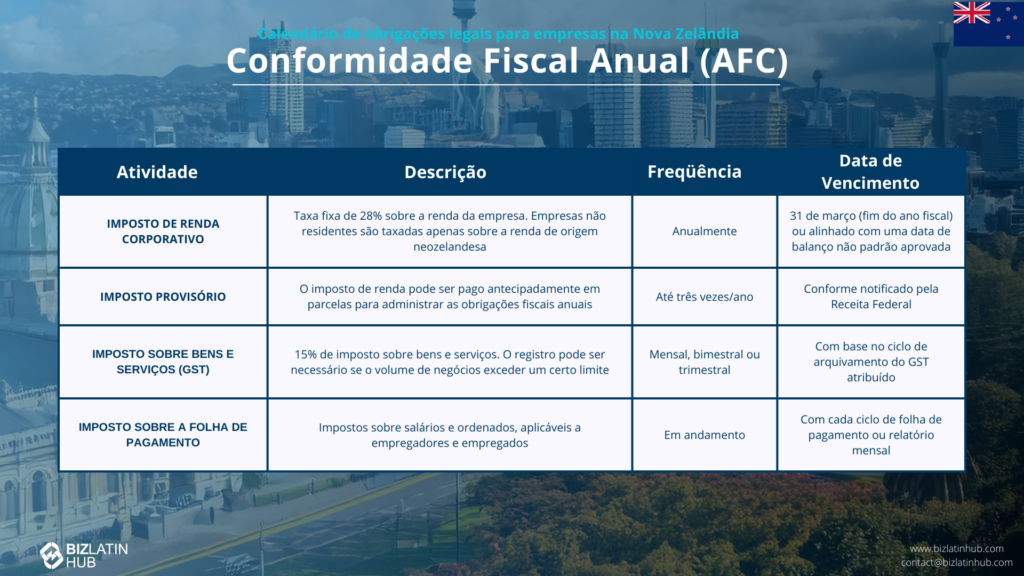 A conformidade fiscal anual na Nova Zelândia envolve o seguinte: