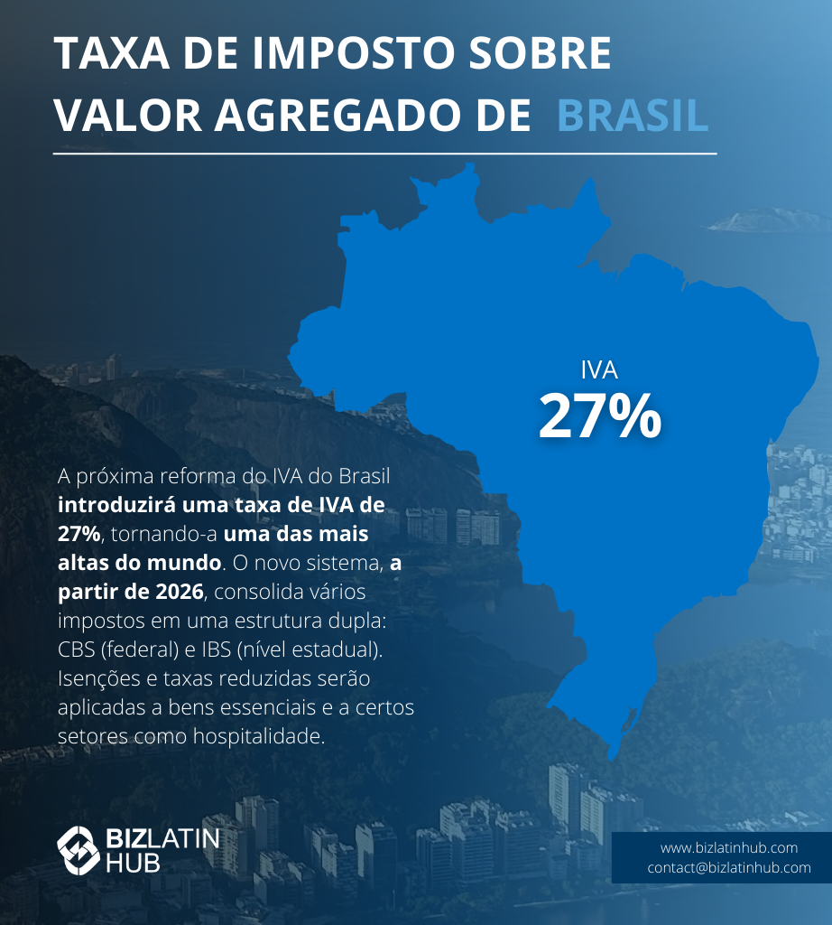 - Os impostos federais e estaduais de IVA se aplicam a vários produtos e serviços, com taxas que variam de 7% a 25%, dependendo do estado. Isso mudará em 2026.