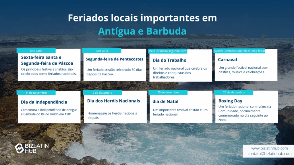 - Antígua e Barbuda tem vários feriados que afetam as operações comerciais. Planeje-se com base neles.