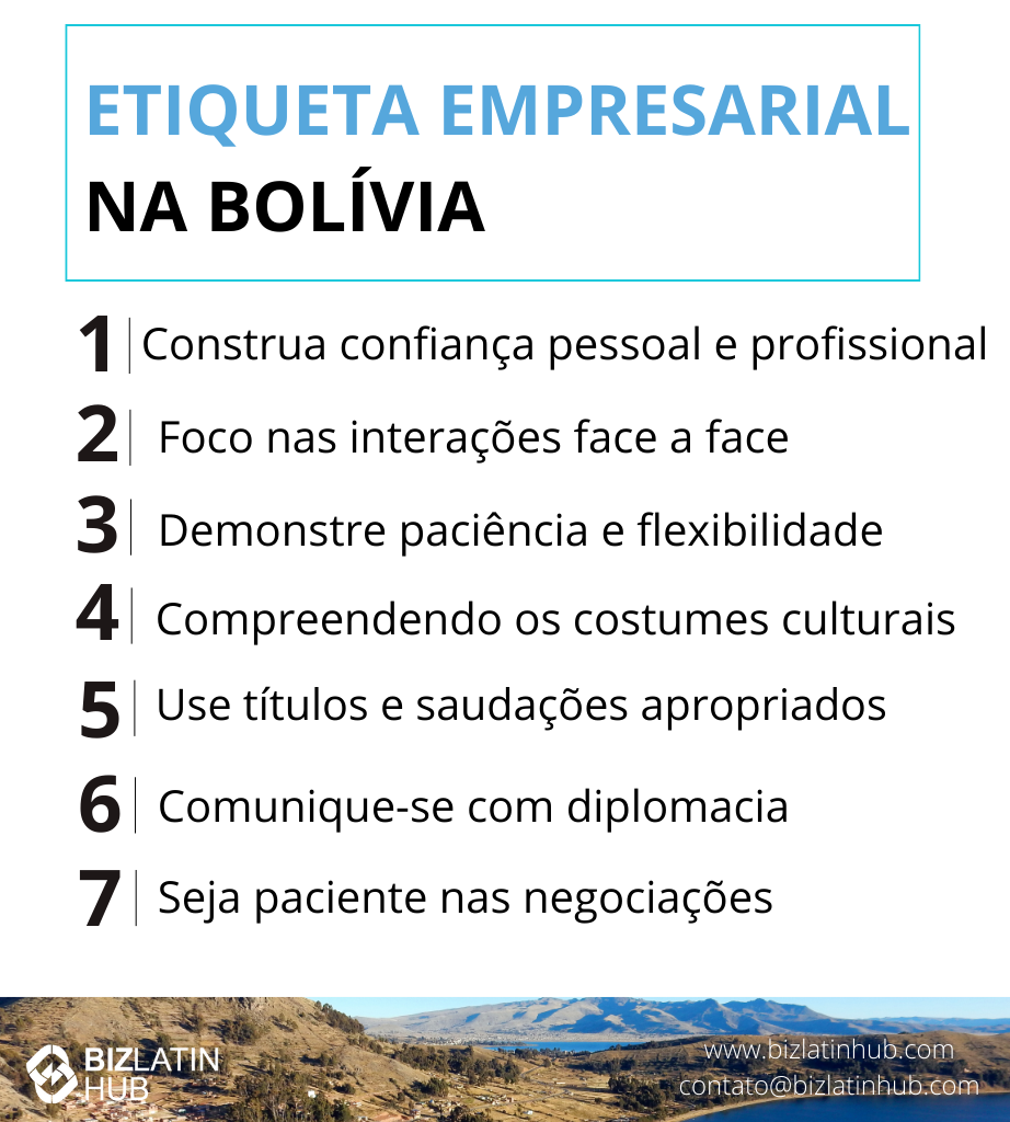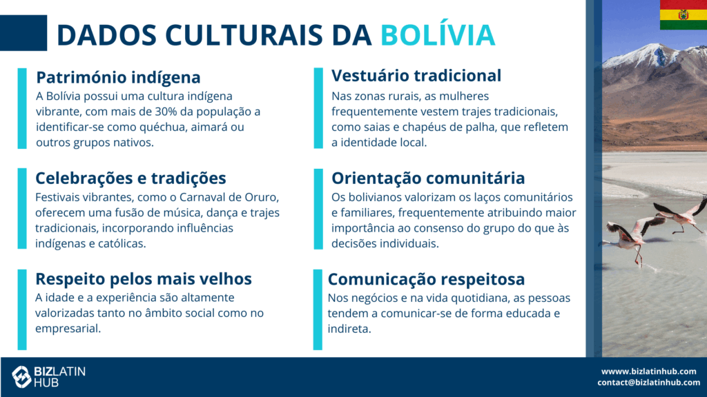 Essas informações ajudam você a trabalhar com a cultura empresarial boliviana. Isso ajuda você a realizar negócios bem-sucedidos.