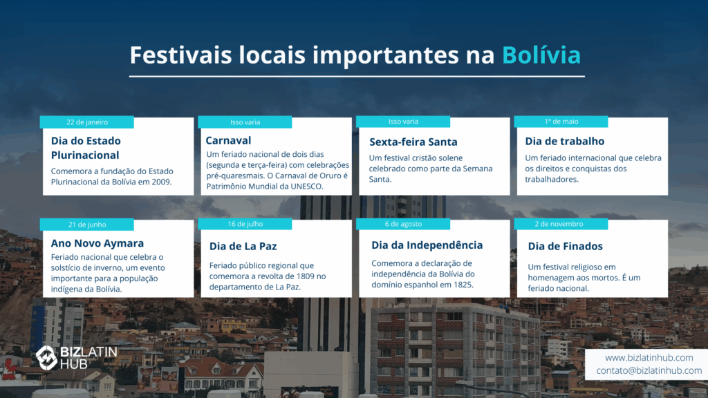 A Bolívia tem muitos feriados nacionais. Ela também tem muitos feriados regionais. Esses feriados podem afetar muito o trabalho comercial. As empresas podem fechar. As atividades podem ficar mais lentas durante esses períodos. O planejamento para esses feriados é muito importante, especialmente para os negócios em 2025.