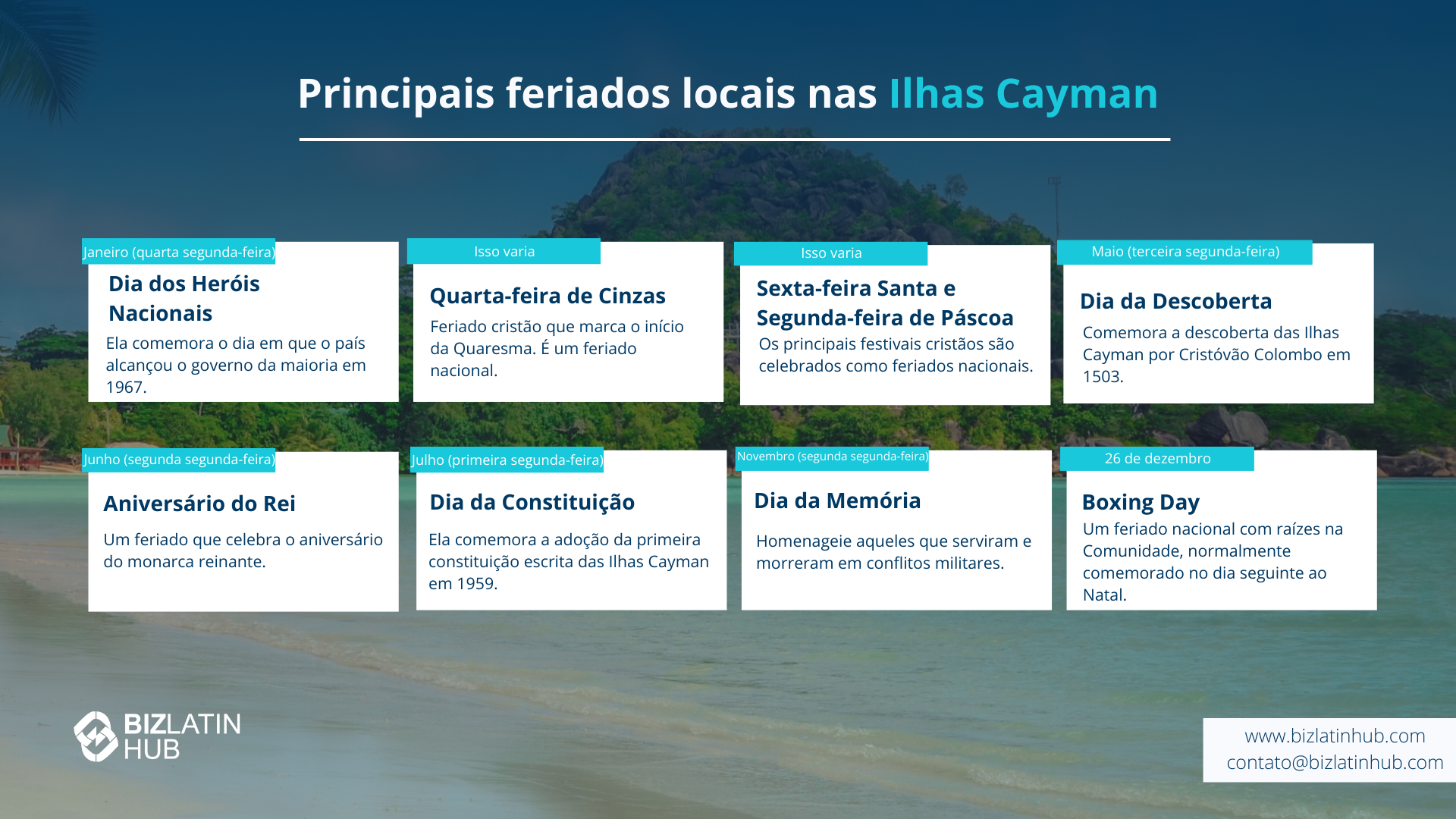 A pontualidade é importante nas Ilhas Cayman? | Chegar pontualmente às reuniões é considerado um sinal de respeito e profissionalismo. |