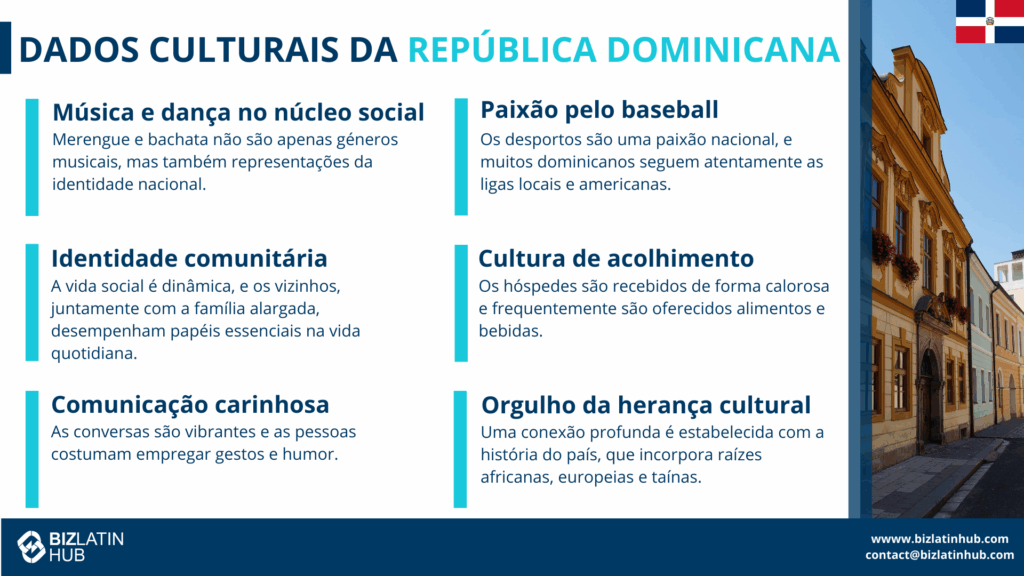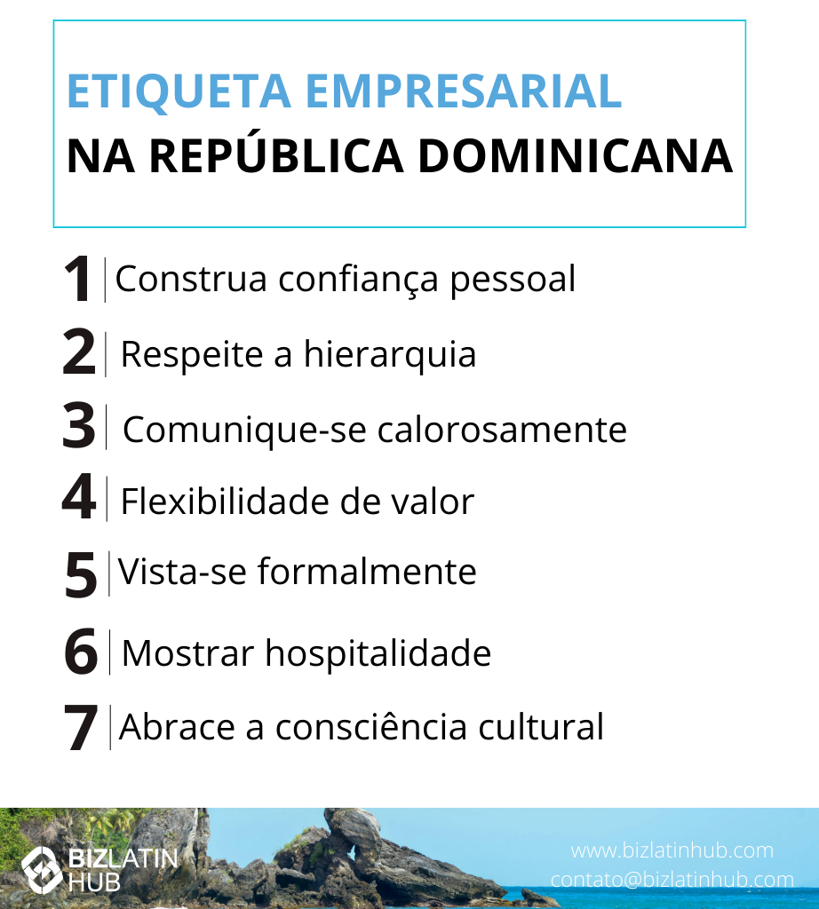 Entender a cultura local e a etiqueta comercial na República Dominicana é fundamental para que você tenha sucesso. Construir relacionamentos pessoais é fundamental. Conversas casuais durante o café ou o almoço ajudam a estabelecer essas conexões. Reconhecer os sinais da cultura dominicana é importante. Combinar tradição com inovação ajuda a criar fortes conexões comerciais.