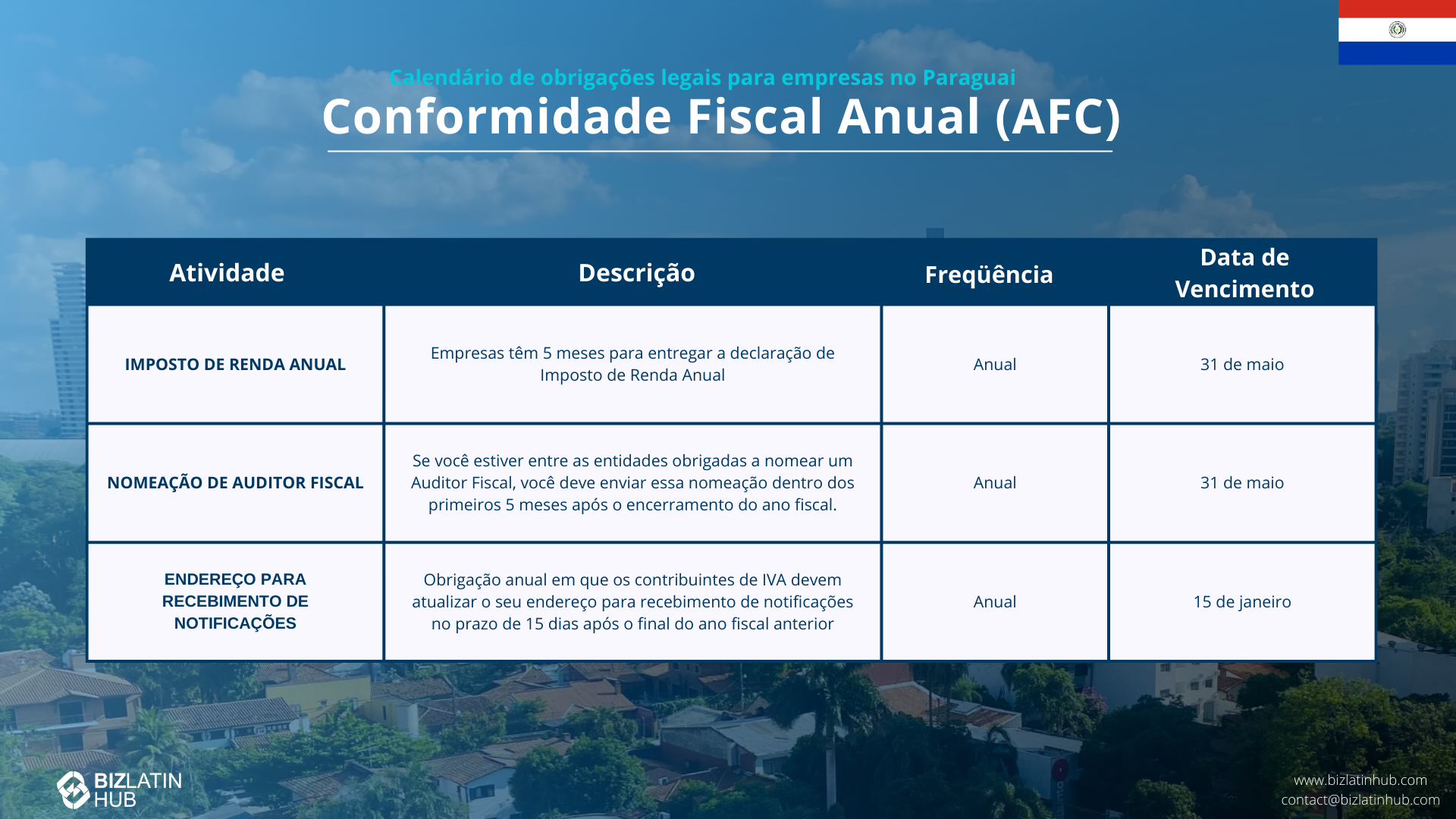 Quais são os requisitos de conformidade fiscal anual da entidade? | Você deve apresentar sua declaração de imposto de renda antes de 31 de maio. Se você estiver entre as entidades obrigadas a nomear um Auditor Fiscal, deve apresentar essa nomeação também até 31 de maio no Paraguai. |