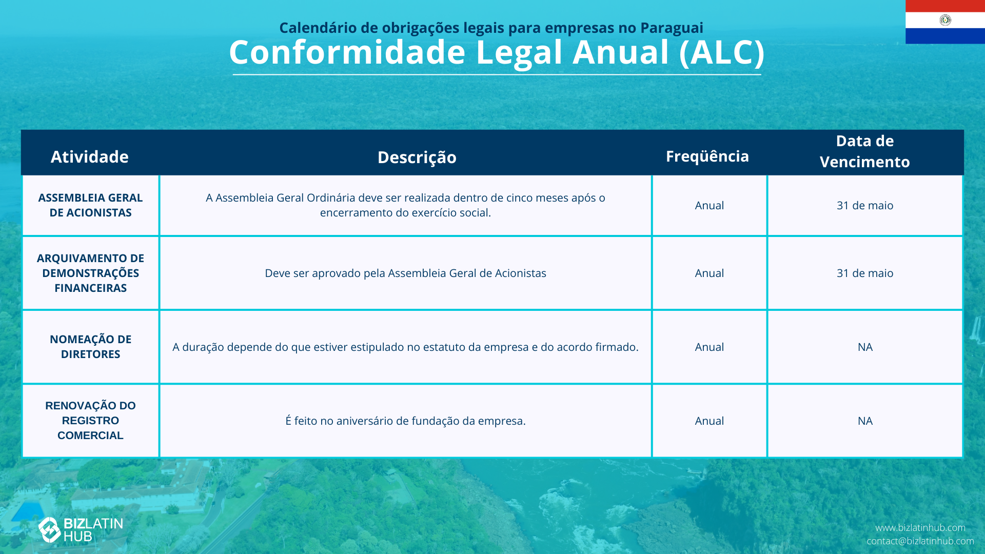 Quais são os requisitos anuais de conformidade legal da entidade? | No Paraguai, a Assembleia Geral Ordinária de Acionistas deve ser realizada dentro de cinco meses após o encerramento do ano fiscal e até o prazo final de 31 de maio. |